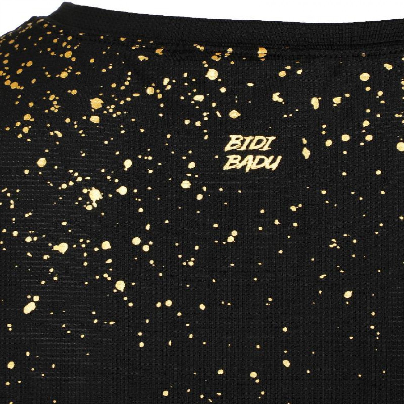 Contra un fondo negro intenso y profundo, brillan motas doradas, inspiradas en el elegante movimiento de las cenizas de las canchas de arcilla en París.